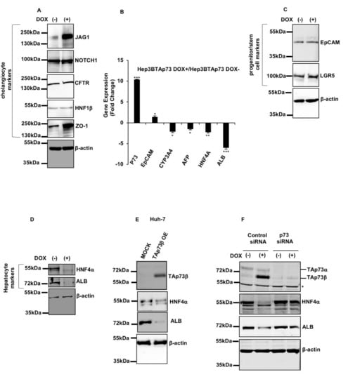 2.5. TAp73β Overexpression Causes Dedifferentiation of HCC Cells by Repressing Hepatocyte Lineage Markers and Inducing Cholangiocyte Lineage Promoters