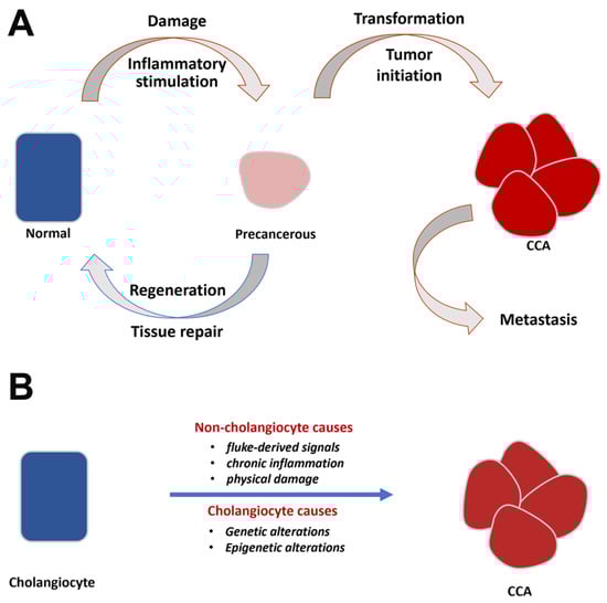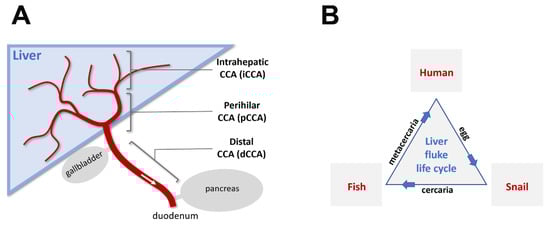 Cholangiocarcinoma (CCA) is a cancer of bile duct epithelial cells (cholangiocytes). It is the second most common type (15%) of liver cancers worldwide, after hepatocellular carcinoma (HCC). CCAs account for about 3% of all gastrointestinal tract cancer and, depending on their origins in the biliary tree, are divided into intrahepatic (iCCA), perihilar (pCCA), and distal (dCCA) CCAs [] (Figure 1A). iCCAs represent a small percentage (10%) of all CCAs [,]. However, in some regions of the world (e.g., northeast of Thailand), CCA incidence (mainly of the iCCA type) could be 100 times higher than the global average, and is the main cause of mortality of all cancer types combined [,] (World Health Organization’s Global Cancer Observatory). Increased CCA risk in Thailand has been postulated to be associated with consumption of raw or undercooked fish infected with liver fluke Opisthorchis viverrini [,,,,], which excysts (leaving its protective cyst) in the duodenum after being ingested by humans, and then matures into adulthood in the bile duct.