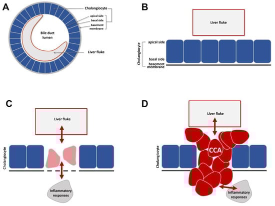 Schematic diagram of how fluke infection in the bile duct leads to CCA. (A,B): An adult liver fluke resides within the lumen of a comparably sized bile duct. Bile duct epithelial cells are called cholangiocytes. Their apical surface faces the lumen and their basal surface is covered by a supporting, non-cellular basement membrane. (C): Fluke infection induces damage, repair, and other genetic and epigenetic changes in surrounding cholangiocytes. This may be mediated indirectly through host responses to infection. (D): CCAs arise as a consequence of chronic fluke infection.