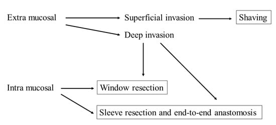 - Hazama, K.; Miyoshi, S.; Akashi, A.; Yasumitsu, T.; Maeda, H.; Nakamura, K.; Tada, H.; Matsuda, H.; >Thoracic Surgery Study Group of Osaka University. Clinicopathological investigation of 20 cases of primary tracheal cancer. Eur. J. Cardiothorac. Surg. 2003, 23, 1–5. [Google Scholar] [CrossRef][Green Version]