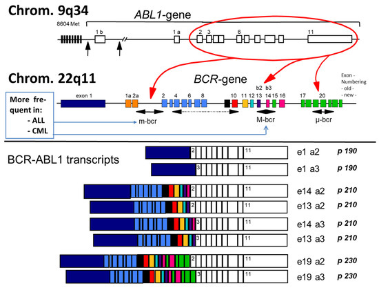 One large breakpoint region (approx. 200 kb) is found in the ABL1 gene on chromosome 9q34 whereas three breakpoint regions are present in the so-called breakpoint cluster region (BCR) gene on chromosome 22q11 (Figure 1). Like in adults, in pediatric CML the vast majority of breakpoints cluster in a small region of the major (M-bcr) breakpoint while alternate, less common breakpoints cluster in the minor bcr (m-bcr) and very rarely further upstream in the BCR gene, in the so-called micro bcr (µ-bcr) [22,23,24]. M-bcr, m-bcr, and µ-bcr are associated with the p190, p210 and p230 BCR–ABL1 fusion proteins, respectively [25]. These three well-defined breakpoint regions in the BCR gene can produce at least eight different m-RNA fusion transcripts (M-bcr, p210: e14a2, e13a2, e14a3, e13a3; m-bcr, p190: e1a2, e1a3; µ-bcr, p230: e19a2, e19a3) because of alternative splicing in the ABL1 gene (splicing to exon 2 or exon 3) and because the M-bcr consists of two intronic regions (intron 13 and intron 14) [25,26].