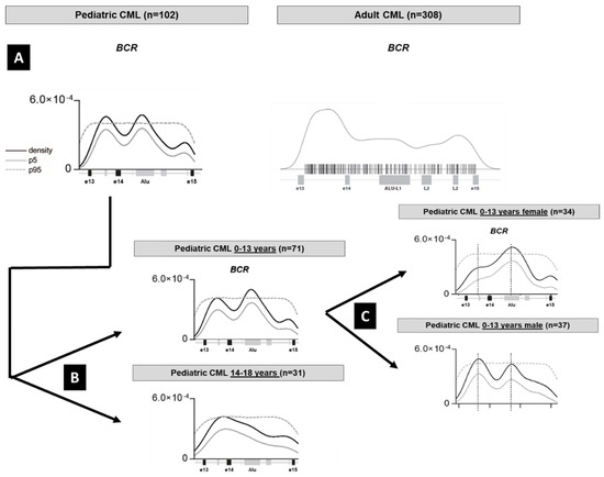 Illustration of the genomic DNA breakpoint distribution in the BCR gene and Kernel density analysis. For details see reference [59]. (A) When the pattern in 102 pediatric patients with CML is compared to 308 adult patients with CML as reported in the literature, pediatric CML shows a bimodal distribution which is also found in Ph1 positive acute lymphoblastic leukemia. (B) The bimodal “ALL-type” breakpoint can be found more frequently in prepubertal children and (C) in the prepubertal cohort is detectable more frequently in boys. In the Kernel plots the gray lines denote the 5% and the dotted line the 95% confidence intervals.