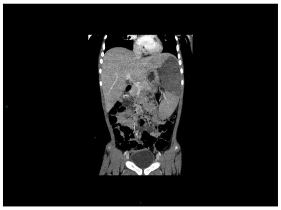 Splenic infarction at diagnosis of CML. A seven years-old girl presented with abdominal pain, splenomegaly and massive leukocytosis. Coronal CT after contrast injection showed an enlarged spleen with a large central hypodensity, well limited, with low enhancement and rectilinear borderlines. Photography by courtesy of Prof. Arnaud Y. Petit, Paris, France. For details and outcome see reference [90].