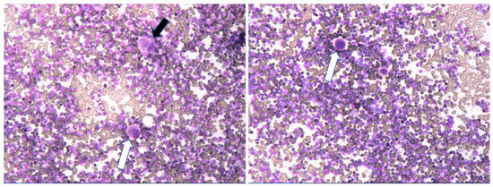 Significant hypercellular marrow at diagnosis of CML-CP showing also small hypolobulated megakaryocytes (black arrow) and micromegakaryocytes (white arrows). Magnification 80×.