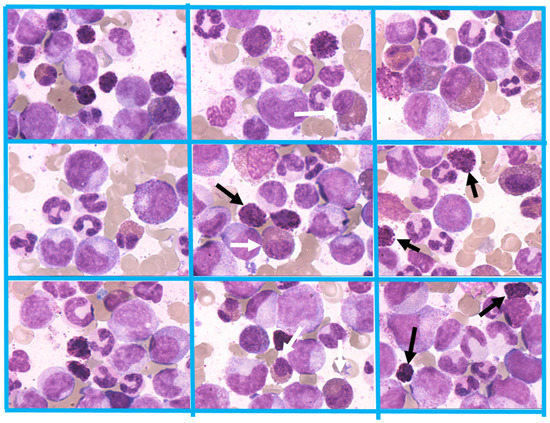 CML-CP presenting with characteristic hyperplasia of the granulocytic lineage with increased number of precursor cells (left-shifted granulopoiesis). In addition, typical immature basophils (black arrows) and immature eosinophils (white arrows) are present. Magnification 800×.