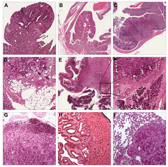 Tumors were surgically induced by segmental colonic infection with adeno-cre virus. Postoperatively, tumor growth was monitored every other week via colonoscopy (Figure 1A–D). At 56, 112, and 168 days after tumor induction, 5–8 mice/genotype/time point were euthanized and the tumors were harvested (Figure 1E) for histopathologic analysis [25,26]. The tumors in the GEMM were almost exclusively adenocarcinomas with typical colorectal adenocarcinoma histomorphology (Figure 2A–I).
