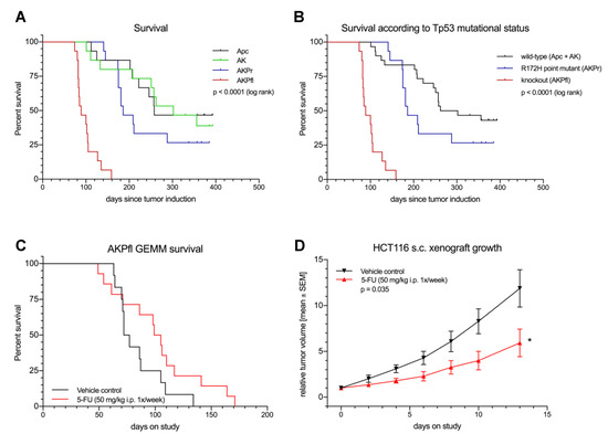 The GEMM mimics the survival and treatment response of human CRC more accurately than a xenograft model. (A) Survival of the GEMM depending on the genotype. (B) Influence of TP53 mutational status on survival in the CRC GEMM. (C,D) Treatment experiments. (C) Kaplan–Meyer survival curves of AKPfl mice treated with 5-FU (50 mg/kg i.p the same regimen. * p < 0.05. Apc, Apcfl/fl mice; AK, Apcfl/fl/KrasLSL-G12D/+ mice; AKPr, Apcfl/fl/KrasLSL-G12D/+/Trp53LSL-R172H/+ mice; AKPfl, Apcfl/fl/KrasLSL-G12D/+/Trp53fl /fl mice.