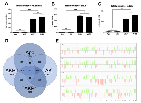 Number of mutations increase considerably in Trp53-alterated tumors. (A–C) Total number of mutations, SNVs and INDELs in tumors of all genotypes. (D) Overlapping mutations (TCGA>1%) in all genotypes (Table S3 for list). (E) Copy number alterations in all genotypes. Green: gains. Red: losses. ** p < 0.01; *** p < 0.001; n.s.: not significant. Apc, Apcfl/fl mice; AK, Apcfl/fl / KrasLSL-G12D/+ mice; AKPr, Apcfl/fl / KrasLSL-G12D/+ / Trp53LSL-R172H/+ mice; AKPfl, Apcfl/fl / KrasLSL-G12D/+ / Trp53fl /fl mice.