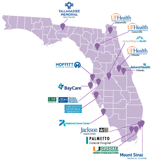 The Florida Pancreas Collaborative (FPC) was founded in 2015 by investigators (JBP, MPM, JGT, NBM) from the three main academic cancer centers based in Florida: Moffitt Cancer Center and Research Institute (MCC, Tampa), the University of Florida Health Cancer Center (UFG, Gainesville), and the Sylvester Comprehensive Cancer Center/University of Miami (UOM, Miami) [24]. Florida Agency for Health Care Administration (AHCA) [25] inpatient discharge data was used to identify institutions throughout Florida with the highest numbers of AA, H/L, and NHW individuals diagnosed and treated for PaCa. We then used internet queries and our professional network to identify and contact clinicians (primarily surgeons and oncologists) to assess interest in participation. Requirements for participation included having a dedicated site principal investigator (PI), institutional support/backing, and willingness to contribute to a common biorepository using standard operating procedures (SOPs). With grant funding from the State of Florida’s James and Esther King Biomedical Research Program in 2018, the FPC expanded to include twelve additional institutions (academic and community cancer centers and private hospitals) including (in alphabetical order): Advent Health Orlando (AHO, Orlando, FL, USA), Jackson Memorial Hospital (JMH, Miami, FL, USA), Lakeland Regional Health Hollis Cancer Center (LRH, Lakeland, FL, USA), Mount Sinai Medical Center (MSM, Miami, FL, USA), Palmetto General Hospital (PGH, Hialeah, FL, USA), Regional Cancer Center (RCC, Fort Myers), Saint Anthony’s Hospital/BayCare (STA, St. Petersburg, FL, USA), Sarasota Memorial Hospital (SMH, Sarasota, FL, USA), Tallahassee Memorial Healthcare (TMH, Tallahassee, FL, USA), the University of Florida Health (UFJ, Jacksonville, FL, USA), Orlando Health University of Florida Health Cancer Center (UFO, Orlando, FL, USA), and the University of South Florida/Tampa General Hospital (USF, Tampa, FL, USA). MCC serves as the lead coordination/management center. A map of participating FPC sites is displayed in Figure 1.