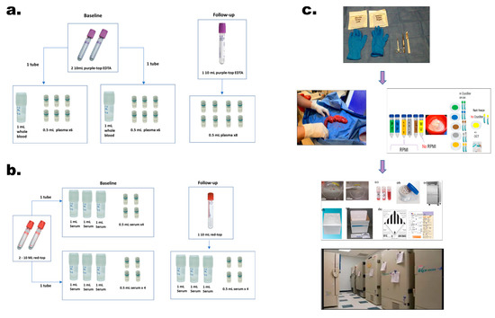 Peripheral blood is donated at baseline (± 30 days of the diagnosis date) and at follow-up in conjunction with routinely-scheduled venipuncture. Using SOPs in line with NCI’s Best Practices, four 10 mL tubes (two red-top, two purple-top EDTA) are collected at baseline and two 10 mL tubes (one red-top, 1 EDTA) are requested at follow-up. The date and time samples are drawn, processed, and stored, and details such as visual hemolysis assessment are recorded. EDTA tubes are slowly inverted 8–10 times and then transferred to the institution’s laboratory for processing 30 min to 2 h after collection. For samples collected at baseline, 1 mL of whole blood (from each EDTA tube) is aliquoted into a cryovial and remaining blood is processed for plasma by centrifugation at 1300 g/RT/10 min and aliquoted as in Figure 2a. The red-topped tubes are processed for serum after allowing 30 min for clotting by centrifuging @1300 g/RT/10 min. At baseline, serum is aliquoted in 1 mL and 0.5 mL volumes (Figure 2b). Follow-up cryovial specifics are shown in Figure 2a,b. All samples are stored in cryoboxes at −80 °C until transferred to MCC.