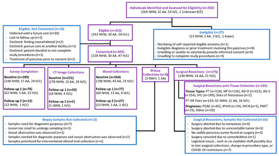 Blood samples have been obtained at baseline for 264 participants (198 NHW, 23 AA, 43 H/L) and at follow-up timepoints 1 and 2 for 77 and 27 participants, respectively (Figure 3). Tissue samples have been collected from 159 of 175 surgical cases, with 119 matched PT-NP pairs, 152 AD-O, and 149 MU samples collected. Most pancreatic tumor samples (n = 114, 91.9%) were collected prior to any treatment, while ten samples were collected post-treatment. Of the 159 participants with available tissue samples, most had a diagnosis of PDAC (52%, n = 82) followed by IPMNs (15%, n = 24) and PNETs (12%, n = 19).