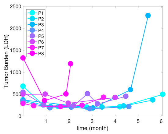 The tumor burdens (measured by LDH level units/liter) of eight melanoma patients in months since the beginning of therapy. All eight patients received continuous MTD of targeted therapy (BRAF and MEK inhibitor).