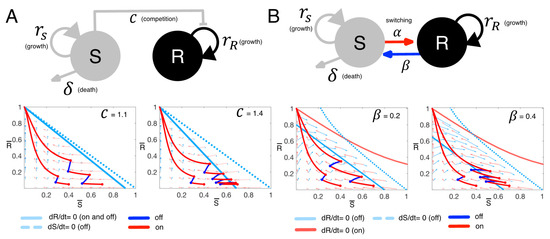 The first model uses Lotka-Volterra (LV) competition Equations (1) and (2) to describe the competition between two distinct cancer cell populations, drug-sensitive (S) and drug-resistant (R) cells (Figure 2A):
