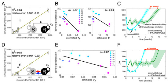 where is the entire model parameter set, and is the predicted total tumor burden () at time and is the actual tumor burden of each patient at time . Here, we assume that LDH is directly proportional to S + R, and the basal (normal) level of LDH is 100 units per liter, as LDH is also produced by normal tissue [32]. The LV model parameter set includes intrinsic growth rates, carrying capacity, death rate, and the competition coefficient. Note, we assume that sensitive cells do not divide when treatment is on ( with therapy on). All patient data is for continuous treatment (at the time of writing, we do not have intermittent therapy results for such patients). Thus, a parameter set for the LV model is , where is the initial level of LDH produced by sensitive cells and , where is LDH level at a time is the initial level of LDH produced by resistant cells. In the SW model, the transition rate from resistant to sensitive is assumed to be zero when treatment is on. The parameter set for the SW model is . We employed a steepest descent optimization algorithm with implicit filtering [33] to identify best-fit parameters for both models (see Supplementary Excel file). Parameter estimations were conducted in MATLAB using the implicit filtering algorithm [33]. We generated patient-specific parameter estimates for each model. The fits to the individual patient data are shown in Figures S2 and S3, Figure 3A,D. The distributions of estimated parameters, variability assessment by interquartile ranges, and L2 norm of the errors are presented in Figures S4−S7. In addition, we perturbed one of the estimated parameter sets 10% and made model predictions with the perturbed parameters (Figures S8 and S9). A few predictions still fit to the data well (close to the data, small error in Figures S8 and S9), while most predictions failed to explain the data (Figures S8 and S9). Across patients, under the LV model, time to progression is negatively correlated with the intrinsic growth rate of resistant cells () and the competition coefficient () (Figure 3B). Under the SW model, time to progression is negatively correlated with the intrinsic growth rate of resistant cells (Figure 3E).