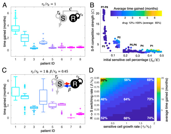 Adaptive therapy simulations. (A) The LV model predicted time gained in months with adaptive therapy compared to continuous therapy (time to progression under adaptive therapy − time to progression under continuous therapy) for all eight patients. All model parameters except the growth rate of sensitive cells are estimated from the LV model fits to individual patient LDH data. The intrinsic growth rate of sensitive cells was set to be the same as the estimated intrinsic growth rate of resistant cells (. (B) Time gained of all 400 virtual patients (50 virtual patients for each actual patient and eight actual patients) as a function of initial sensitive cell proportion () and S-R competition coefficient (). Dots: Average virtual patient assuming 5–200% of the estimated per each estimated parameter set obtained from the real patients. (C) The SW model predicted time gained in months with adaptive therapy for all eight patients. All model parameters except for the intrinsic growth rate of sensitive cells () and R→S transition rate () were estimated from SW model fits to LDH data. The intrinsic growth rate of sensitive cells was set to be the same as the estimated intrinsic growth rate of resistant cells () and the was set to 45% of the estimated intrinsic growth rate of resistant cells (). (D) Average time gained for all 400 virtual patients varied with the intrinsic growth rate of the sensitive cells and the R→S transition rate (). Color: time gained in months. Percent represents the average dose rate relative to continuous therapy.