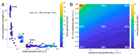 To further explore the significant differences across the eight patients in the LV model, we simulated patient-specific adaptive therapies using the cohort of 400 virtual patients over a broad range of intrinsic growth rates ( 5–200% of the estimated ). The estimated competition coefficient, C, and the estimated initial size of the sensitive population () are key for determining the benefit (time gained) of adaptive therapy relative to continuous therapy (Figure 4B). In Figure 4B, each colored dot is an average virtual patient of 5–200% of the estimated per each estimated parameter set obtained from the real patients. If the initial sensitive cell percentage is smaller than 10%, time to tumor progression under adaptive therapy is not significantly different from continuous therapy (time gained 1 month, patient #3, #7, #8). The larger the competition coefficient (), the more time was gained (Figure 4B), provided that the initial sensitive cell population ranges from 10% to 40% of carrying capacity. Adaptive therapy is most successful for tumors with a high initial number of sensitive cells (>40% of K, see patients #1). For adaptive therapy, the percent time on treatment varied between patients (i.e., the cumulative dose rate of 12% to 100% of continuous therapy), with an overall average of 65%. In the simulations, we assume treatment dose per treatment day in adaptive therapy is the same as continuous therapy. The drug dose implies time on the drug. The cumulative dose rate of 12% means 12% of the time on the drug compared to continuous therapy.