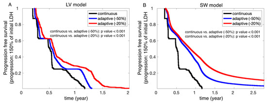 Finally, we compared the probability of progression-free survival of all virtual patients under continuous, −50%, and −20% stopping adaptive therapies. Since we developed two mathematical models, LV and SW, we generated two sets of Kaplan-Meier curves (Figure 6, A: LV, B: SW). For these K-M curves, we used all virtual patients with either the LV or the SW model. This “trial” group was then subjected to the two adaptive trial procedures (−50% and −20% stopping threshold) and continuous therapy. Here, we assume that tumor progression occurred when LDH levels reached 150% of their initial LDH (Figure 6, A: LV, B: SW). The two models predicted a longer progression-free survival under both adaptive therapies (p < 0.001), with a 20% threshold being superior to the 50% stopping criterion.
