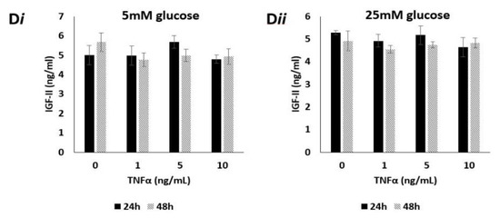 Having observed the influence of TNFα on IGF-II mRNA expression, we next investigated whether this translated into the secreted peptide. Conditioned media from the TNFα dosing experiments was collected and quantified for peptide using radioimmunoassay (RIA). Cells cultured in 5 mM glucose and exposed to increasing doses of TNFα (0, 1, 5 and 10 ng/mL) for 24 and 48 h, showed no significant changes to secreted IGF-II peptide (Figure 2Di). This was also true of cells cultured in 25 mM glucose, exposed to identical doses of TNFα after identical time points (Figure 2Dii).