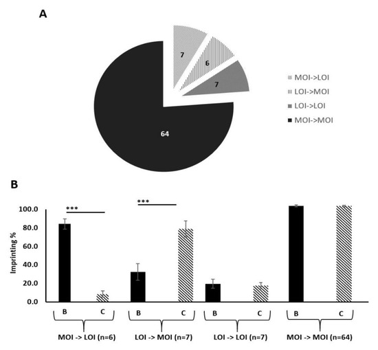 Imprinting status of paired benign and malignant prostate tissue samples from the PrEvENT cohort. (A) Cohort divided by imprinting status change, moving from benign to corresponding malignant counterpart. Of the total cohort (84 tissue pairs), 64 showed no change of maintenance of imprinting (MOI) from benign to malignant; 7 showed no change of loss of imprinting (LOI), from benign to malignant; 6 showed a change from LOI to MOI and 7 showed a change from MOI to LOI. (B) Imprinting status sub-divisions of PrEvENT cohort, with changes in imprinting percentage. A significant decrease (p < 0.001) in imprinting percentage was seen in samples where imprinting status changed from MOI to LOI (n = 7); conversely, a significant increase (p < 0.001) in imprinting percentage was seen in samples where imprinting status changed from LOI to MOI (n = 6). (B = benign tissue, C = cancer tissue) (*** p < 0.001)