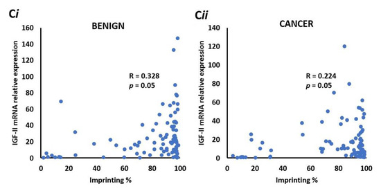 To identify whether IGF-II mRNA expression correlates with imprinting percentage in the PrEvENT cohort, ddPCR data was plotted against imprinting percentages; a significant (p = 0.05) positive correlation (R = 0.328) was found in benign prostate tissue (Figure 4Ci), which was marginally weaker in malignant tissue (p = 0.05 and R = 0.224) (Figure 4Cii).