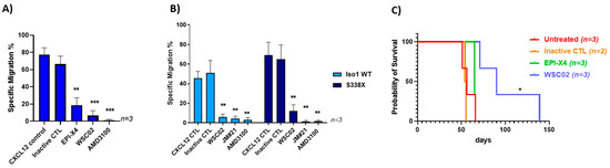 Since EPI-X4 efficiently binds to CXCR4 mutants, we initiated functional assays testing the effect of this naturally occurring CXCR4 antagonist on migration of WM cells towards a CXCL12 gradient in vitro. Transwell assays revealed that EPI-X4 reduces migration compared to an inactive control peptide in BCWM.1 cells expressing wildtype or S338X CXCR4 by 65% and 45%, respectively (Figure 3C). When assessing the effect of EPI-X4 on clonogenic growth of different CXCR4 mutants we could not find that the endogenous CXCR4 inhibitor impairs in vitro growth of WM cells (Figure S1C).