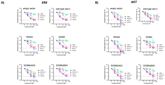 Inhibition of ERK and AKT signaling by EPI-X4 and its optimized derivatives in WM cells. (A) ERK and (B) AKT phosphorylation in WM cells upon incubation with EPI-X4 and its optimized derivatives. Cells were stimulated with CXCL12 and incubated with the different peptides. Cells were analyzed by flow cytometry with FACS Cytoflex for phosphorylation of Erk1/Erk2 (n = 3–5). (* p < 0.1, ** p < 0.01, *** p < 0.001, **** p < 0.0001, ns = not significant).