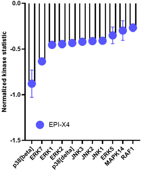 Kinomic changes in MAPK signaling of EPI-X4 treated BCWM.1 cells. Relative kinase activity in EPI-X4/CXCL12 treated vs. CXCL12 treated BCWM.1 cells after 10 min. Incubation of the cells with 200µM EPI-X4 and 10nM CXCL12. Kinases were ranked using a combined score based on a sensitivity score indicating group difference and specificity score derived for a set of peptides related to the respective kinase. This information is extracted from current experimentally derived or in silico databases (BN6). Shown are candidates with a relative kinase activity of −0.25 compared to untreated cells including top candidates related to the MAPK pathway with p38 (delta), p38 (beta) and ERK family members 1, 2 and 5 with a specificity-score of <1.3.