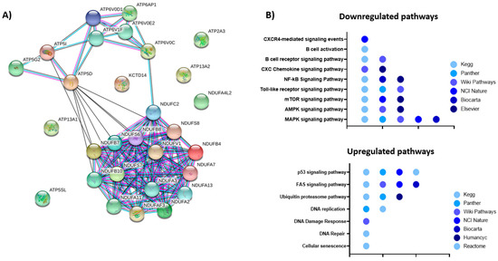 Impact of EPI-X4 on gene expression. (A) String analysis of significantly downregulated genes (FDR < 0.05) involved in energy metabolism. (B) Pathway analysis of differentially expressed genes upon EPI-X4 treatment compared to inactive peptide control (FDR < 0.05). Gene set enrichment tools implemented in Enrichr http://amp.pharm.mssm.edu/Enrichr/ (accessed on 16 February 2021)) were used for the analyses. All gene sets were filtered with an adjusted p-value < 0.05.