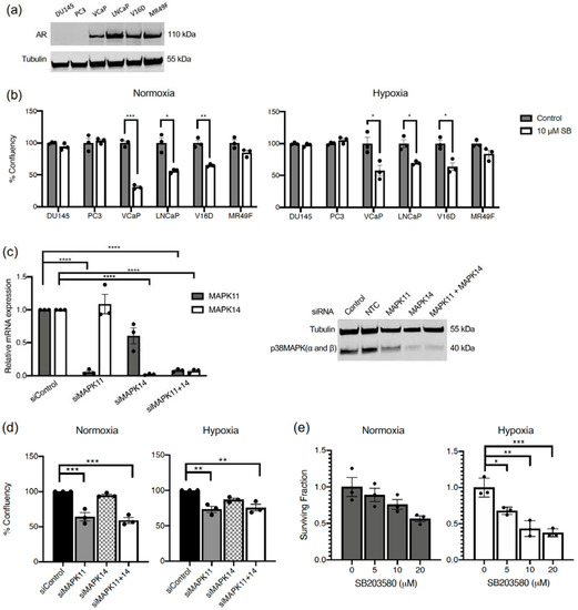 Furthermore, since the efficacy of both radiotherapy and chemotherapy is hampered by hypoxia, p38 MAPK inhibition could represent an alternative or complementary strategy for patients carrying hypoxic tumors. Whether this would be more attractive than current second line anti-androgen treatments remains to be seen, and would probably depend on toxicity profiles and co-morbidities. On that note, p38 is well-known to regulate inflammation, and a few studies have suggested that p38 inhibition might mitigate radiation-induced gene expression associated with promotion of inflammation [35,36,37]. It would be interesting to assess whether p38 inhibition thereby could offer radioprotection of normal tissues and further widen the therapeutic window in the context of radiotherapy.