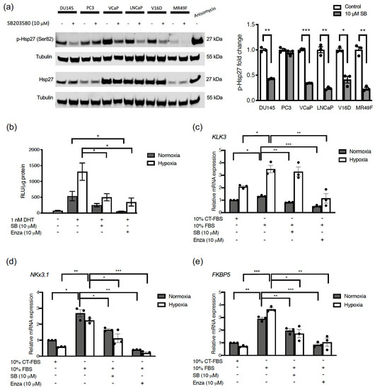 p38 MAPK inhibition decreases Hsp27 phosphorylation, AR activity and expression of AR target genes under normoxia and hypoxia. (a) Prostate cancer cell lines (DU145, PC3, VCaP, LNCaP, V16D, MR49F) were treated with 10 µM SB203580 for one hour and subjected to western blotting (left). V16D cells were treated with 25 µM of anisomycin for one hour as a positive control for p38 MAPK activation. Densitometry analysis was performed to calculate fold change of p-Hsp27 (Ser82) relative to Hsp27 for each cell line. (b) V16D cells were transfected with a plasmid encoding luciferase driven by the AR promoter. 24 h later, cells were treated with 1 nM DHT, 10 µM SB203580, or 10 µM enzalutamide (Enza) in 10% charcoal treated (CT)-FBS media (androgen depleted) and incubated under normoxia (21% O2) or hypoxia (0.2% O2) for 48 h. Relative light units (RLU) from luciferase was measured after addition of luciferin. (c–e) V16D cells were treated with 10 µM SB203580, or 10 µM enzalutamide for 48 h and relative mRNA expression of KLK3 (c), NKx3.1 (d), and FKBP5 (e) was measured by RT-qPCR normalized to the average of HPRT1 and GUSB gene expression. Fold change was calculated relative to the 10% CT-FBS negative normoxia control. Data points represent an independent experiment and bars represent the mean value ± S.E.M. (*: p ≤ 0.05; **: p ≤ 0.01; ***: p ≤ 0.001).