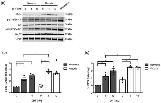 Androgen and hypoxia activate p38 MAPK and Hsp27. (a) V16D cells were exposed to 0 nM, 1 nM, or 10 nM DHT in charcoal-stripped media for 6 h in normoxia (21% O2) or hypoxia (0.2% O2). 25 µM of anisomycin for one hour was used as a positive control for p38 MAPK activation. Total cell lysates were subjected to western blotting. Densitometry analysis of protein bands was performed to calculate fold change of p-p38 (Tyr182) (b) and p-Hsp27 (Ser82) (c) relative to normoxia control with 0 nM DHT and normalized to eIF4E. Data points represent independent experiments and bars represent the mean value ± S.E.M. (*: p ≤ 0.05; **: p ≤ 0.01; ***: p ≤ 0.001).