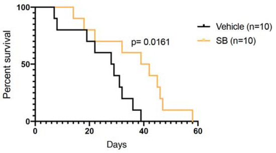 Since p38 MAPK inhibition by SB203580 could block Hsp27 phosphorylation, reduce expression of AR-driven gene expression and inhibit cell proliferation and survival in normoxia and hypoxia, we sought to determine whether SB203580 could also inhibit tumor growth in V16D xenografts. To this end, we established subcutaneous xenografts in immune compromised male mice, and treated them with SB203580 once tumors reached 200 mm3. SB203580 was well-tolerated and did not lead to any apparent clinical side-effects. Some mice reached endpoint early in the study, precluding comparisons of average tumor volumes in the two treatment groups (Figure S2a). However, SB203580 treatment significantly prolonged survival of tumor bearing mice (Figure 4). During treatment, we also collected blood for serum PSA measurements as a reflection of AR activity and tumor burden. Although PSA levels were highly heterogeneous, we observed that over the last week of life, only 1 out of 8 mice in the SB203580 treated group had a >1.5-fold increase in PSA levels, compared to 5 out of 8 in the control group (Figure S2b) (p = 0.07). Taken together, our results demonstrate that SB203580 can slow growth of CRPC xenografts.