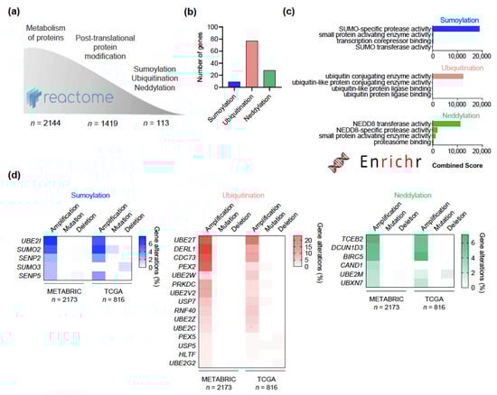 Common genomic alterations in ubiquitination, SUMOylation, and neddylation in breast cancer. (a) Flow chart showing the interrogation of the Reactome database to identify genes involved in post-translational protein modifications, particularly ubiquitination, SUMOylation, and neddylation. (b) Bar graph summarizing the number of genes participating in each process. Only UCHL3 participated in both ubiquitination and neddylation. (c) Bar graph showing the GO molecular function of the genes previously identified for each process, sorted by the combined score in the EnrichR database. (d) Heatmap presenting the frequency of patients from the TCGA and METABRIC datasets with amplifications, mutations, and deletions, of the genes involved in each process. Only genes with a frequency of amplifications higher than 2% are displayed, those under 2% can be found in Figure S1.