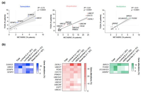 Breast cancer is a major cause of death worldwide and remains incurable in advanced stages. The dysregulation of the post-translational machinery has been found to underlie tumorigenesis and drug resistance in preclinical models but has only recently led to early trials in cancer patients. We performed an in silico analysis of the most common genomic alterations occurring in ubiquitination and ubiquitin-like SUMOylation and neddylation using data from publicly available repositories and with the aim of identifying those with prognostic and predictive value and those exploitable for therapeutic intervention. Clinical and statistical criteria were used to sort out the best candidates and the results were validated in independent datasets. UBE2T, UBE2C, and BIRC5 amplifications predicted a worse survival and poor response to therapy across different intrinsic subtypes of breast cancer. Mutated USP9X and USP7 also conferred detrimental outcome. Leveraging these molecular vulnerabilities as biomarkers or drug targets could benefit breast cancer patients.