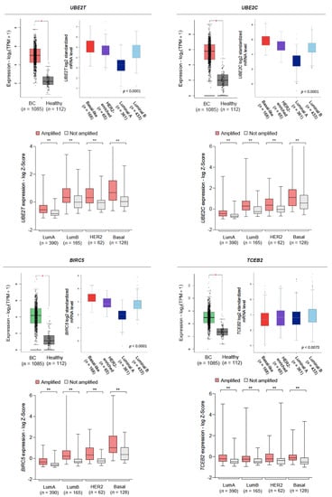To evaluate whether gene amplifications truly impacted mRNA levels, we first interrogated the GEPIA2 web tool [,]. Significantly increased mRNA levels were found in breast tumors compared to healthy controls for UBE2T, UBE2C, BIRC5, TCEB2 (Figure 3). Although non-significant, most of the other genes consistently showed increased mRNA levels in tumor samples. Further, the bc-GenExMiner 3.0 and UALCAN databases were used to study how the expression of those genes with significantly increased mRNA levels distributed across the different intrinsic subtypes and tumor stages [,]. Remarkably, mRNA levels of UBE2T, UBE2C, and BIRC5, were found significantly higher in basal-like tumors compared to luminal A tumors, whereas TCEB2 mRNA levels were found higher in luminal A tumors compared to basal-like tumors, although this difference was slight. By analyzing individual patient data from the TCGA database, we confirmed that patients with gene amplifications had higher transcriptional levels across the different intrinsic subtypes (Figure 3). For all genes, expression tended to be highest in stage IV samples and lowest in stage I (Figure S2a). Similarly, protein levels were highest in basal-like tumors and lowest in luminal tumors, with the exception of TCEB2, thus pointing to a positive correlation between the protein burden and a more dedifferentiated phenotype (Figure S2b). Also of note, a significantly lower promoter methylation level was found in the UBE2T gene in BC samples with respect to normal tissues, which is consistent with an enhanced gene expression. Conversely, BIRC5 showed a higher promoter methylation level in tumors (Figure S2c).
