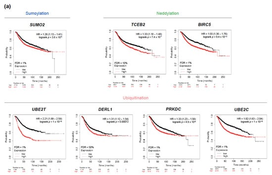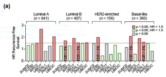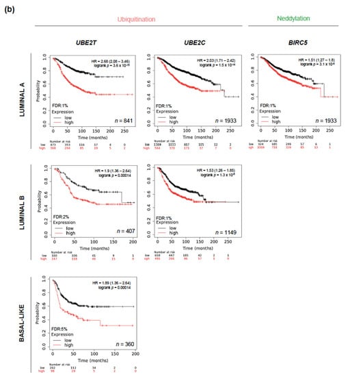 In addition to ubiquitin, the ubiquitin superfamily also contains ubiquitin-like proteins, including Nedd8 and SUMO, which do not only have sequence homology and structural similarity to ubiquitin but also use a similar enzymatic cascade to modify their substrate proteins []. We reported that BIRC5 amplification is a biomarker of a worse prognosis in luminal A patients, and also predicts a worse response to adjuvant endocrine therapy or chemotherapy in these patients. These findings are consistent with a recent in silico analysis by Dai et al. and with the observation by Hamy et al. that BIRC5 predicts a worse RFS in stage II/III BC patients of all intrinsic subtypes who do not achieve a pCR after neoadjuvant chemotherapy [,]. Surprisingly, the promoter methylation level of BIRC5 was found to be increased in tumor samples, which appears to go against its expression pattern. Although this finding has not been clearly explained in BC, previous observations in endometrial cancer have found that the hypermethylation of the BIRC5 promoter blocks the binding of p53, a repressor of BIRC5 gene transcription, to its promoter region, thus increasing its expression [,]. Also interestingly, BIRC5 is one of the genes included in the Oncotype DX®, Endopredict® and Prosigna® signatures. There is in vitro evidence that repressing BIRC5 expression by siRNA could significantly inhibit proliferation and also induce a BRCAness phenotype with DNA double-strand breaks and a functional impairment of homologous recombination [,]. A comprehensive review by Li et al. has recently gathered together the advances in cancer therapeutics targeting BIRC5 [].