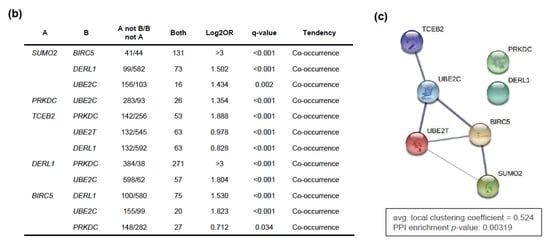 The KM plotter tool was used to explore the prognostic role of each gene amplification occurring in more than 2% of patients in both TCGA and METABRIC datasets []. High transcriptional levels of SUMO2, TCEB2, BIRC5, UBE2T, DERL1, PRKDC, and UBE2C, were associated with a shorter relapse-free survival (RFS) and their Kaplan-Meier curves are displayed in Figure 4a. Further, we validated these results by interrogating the METABRIC and TCGA datasets and found that BIRC5, UBE2T, and UBE2C remained significantly linked to a worse RFS with a false discovery rate (FDR) <5% for almost all associations (Table S1a; clinicopathological features of patients from TCGA and METABRIC datasets with survival data are summarized in Table S1b). Stratification by nodal involvement and histological grade did not substantially modify the association with outcome, although most analysis presented an FDR >10%, probably due to the limited population sample in each group (Table S1c). Only BIRC5, UBE2T and UBE2C remained significantly linked to a worse RFS with an FDR of 1% in the subgroup of node positive patients. Interestingly, most of these amplifications were co-occurrent within the same tumors, displaying a strong statistical association (Figure 4b), and yet cytogenetic mapping showed that only BIRC5 and SUMO2, and DERL1 and PRKDC, are located in the same chromosomes and arms (17q25.3 and 17q25.1, and 8q24.13 and 8q11.21, respectively). The STRING database was used to map their interaction network revealing a significant enrichment p-value and low-to-moderate local clustering coefficient, defined as the likelihood of the connection (Figure 4c).