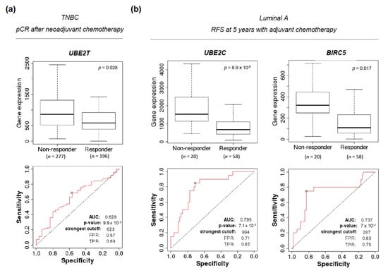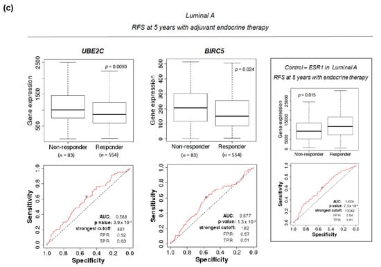 The ROCplot online tool was used to evaluate whether higher transcriptional levels of UBE2T, UBE2C, and BIRC5, could qualify as putative biomarkers of response to (neo)adjuvant therapy in BC []. In the neoadjuvant setting, UBE2T performed substantially well as a surrogate of a worse rate of pathological complete response (pCR) after chemotherapy in TNBC (AUC 0.629, chi-square p = 0.028) (Figure 6a). In the adjuvant setting, a higher expression of UBE2C and BIRC5 predicted a poorer response in luminal A patients treated with chemotherapy (AUC 0.796, chi-square p = 8.9 × 10−5, and AUC 0.737, chi-square p = 0.017, respectively), although the limited number of evaluable patients calls for a cautious interpretation and further validation (Figure 6b). A higher expression of UBE2C and BIRC5 also significantly, although slightly, correlated with a shorter RFS in luminal A patients receiving adjuvant hormone therapy (AUC 0.588, chi-square p = 0.0093, and AUC 0.577, chi-square p = 0.024, respectively) (Figure 6c). A control analysis was performed assessing the expression of ESR1, a clinically established biomarker predictive of response to endocrine therapy. A combined signature of UBE2C and BIRC5 was statistically significant in both scenarios but did not increase the predictive capability.