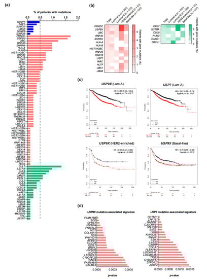 Mutational landscape and prognostic implications. (a) Frequency of gene mutations in breast cancer patients from the TCGA dataset. (b) Distribution of the frequencies of gene mutations over 0.5% across intrinsic subtypes. Population is limited to those patients in which the intrinsic subtype is available in cBioPortal for stratification. (c) Significant associations between the transcriptomic signatures of USP9X and UP7 mutations and overall survival across intrinsic subtypes. (d) Top USP9X and USP7-associated transcriptomic signature components, sorted by p-value.