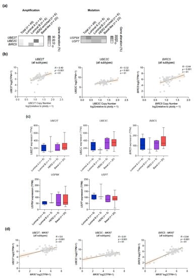 Finally, we searched for putative in vitro models that could help characterize the molecular underpinnings of the genomic alterations identified from patient data. To this end, we interrogated the Cancer Dependency Map (DepMap) portal, the Catalogue of Somatic Mutations in Cancer (COSMIC), and at the Cancer Cell Line Encyclopedia (CCLE), as described in Materials and Methods [,,,]. In contrast to the high prevalence of UBE2T, UBE2C, and BIRC5 amplifications in BC patients, only 2/49 cell lines (JIMT-1 and HCC1569) harbored UBE2C amplifications and 3/49 cell lines (HCC1143, OCUB-M, and MDA-MB-361) harbored BIRC5 amplifications (Figure 8a; Table S4). The copy number of these genes positively correlated with mRNA levels, and transcript levels were strongly associated with Ki67 expression, which is consistent with a more proliferative phenotype and a poorer prognosis (Figure 8b,c). Expression of UBE2T, UBE2C and BIRC5 distributed across intrinsic subtypes in a similar fashion to BC patients, with a tendency to be highest in basal-like cells and lowest in luminal cells. However, this trend lacked statistical significance, likely due to the limited sample size (Figure 8d). More cell lines presented mutations in USP9X (8/49) and USP7 (5/49), although an unexpected high frequency of USP9X mutations in luminal cell lines was found along with a poor overall concordance with the mutational profile of patients. The predictive capability of the set of gene amplifications was explored using data from comprehensive online repositories (see Materials and Methods). No robust associations were observed, with varying trends among databases and reduced sample sizes as a result of our effort to stratify cell lines according to their intrinsic subtypes to recapitulate the actual clinical setting (Figures S4 and S5).