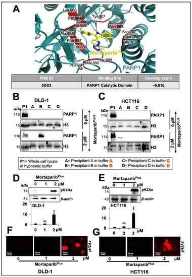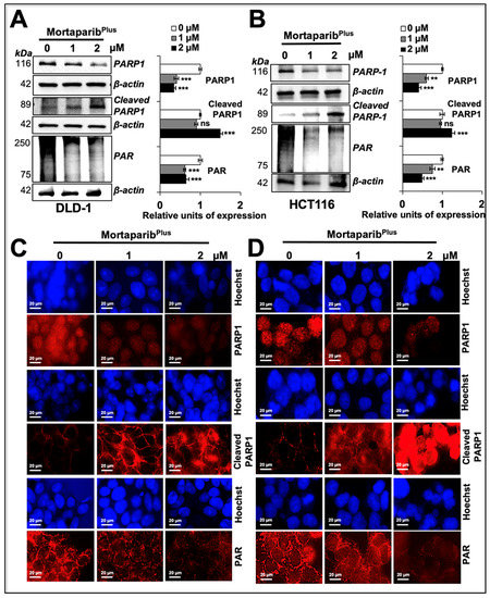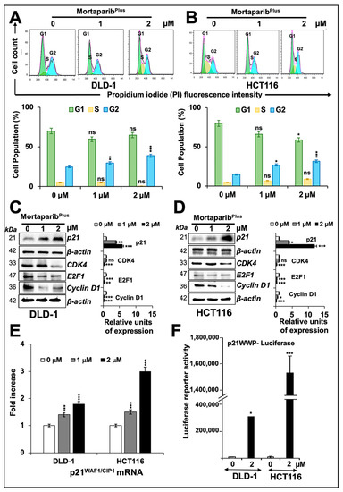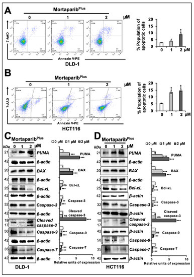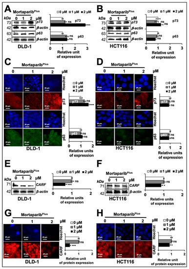 2.3. MortaparibPlus Caused Apoptosis and Cell-Cycle Arrest in DLD-1 (p53S241F) and HCT116 (p53WT) Cells through p53-Dependent and -Independent Manners