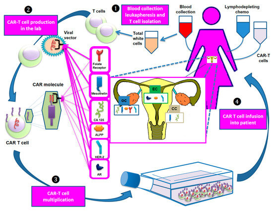 The main steps of the development of CAR-T cell therapy. Step 1: T cells are collected via apheresis. Step 2: The collected T cells are sent to a laboratory and genetically engineered by introducing specific DNA genes through a viral vector to produce CARs on the T cell surface. These molecules are designed to bind specific antigens (e.g., mesothelin, CA125) that recognize and destroy the tumor cells expressing them. Step 3: The re-engineered CAR-T cells are multiplied, frozen and (Step 4) reinfused into the patient. Before reinfusion, lymphodepleting chemotherapy is administered. Abbreviations: ALPP: placental alkaline phosphatase; AR: androgen receptor; CC: cervical cancer; EC: endometrial cancer; HER-2: human epidermal growth factor receptor 2; OC: ovarian cancer.
