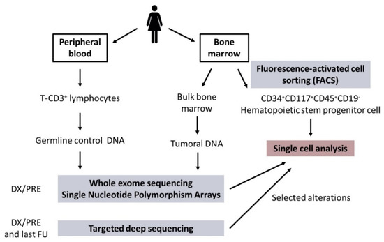 BM and PB samples were obtained from all patients at DX/PRE and from available FU. BM samples were used to isolate bulk tumoral DNA and to sort CD34+CD117+CD45+CD19− HSPC for subsequent SC studies. Matched germline control DNA was obtained from T-CD3+ lymphocytes from DX/PRE PB samples. A general overview of the sample processing is shown in Figure 1.