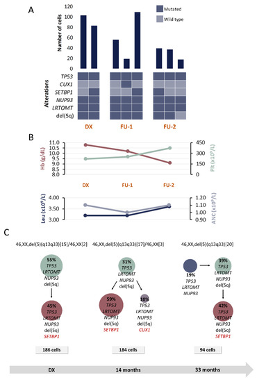 At DX, a clone harboring TP53, LRTOMT, NUP93 and del(5q) followed a linear evolutionary process and gave rise to another subclone that acquired SETBP1 mutation. These two clones could be detected in both FU samples. Additionally, 14 months after DX, a subclone harboring CUX1 mutation was detected. This subclone could not be detected in the sample obtained 33 months after the DX; however, another clone harboring TP53, LRTOMT, NUP93 but without del(5q) was detected. It was inferred that this clone might precede the other ones.