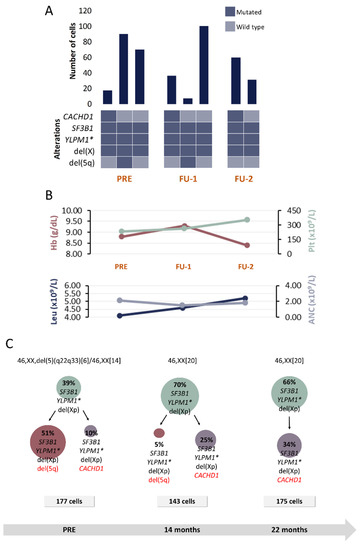 Clinical and molecular characteristics of patient P2. (A) Bar plot depicts the number of cells with a given genotype for each clone that was detected at the moment of pre-treatment (PRE), 1st follow-up (FU-1) and 2nd follow-up (FU-2). Heatmap below the bars indicates the genotype for each clone: dark blue and light blue are used to indicate the mutated or wild-type state, respectively. (B) Hematological characteristics such as hemoglobin (Hb), platelet count (Plt), leukocyte count (Leu) and absolute neutrophil count (ANC) are indicated for each analyzed time point. (C) Proposed clonal architecture, karyotype and number of analyzed cells for each time point is indicated. Color red distinguishes new acquired alterations in each clone. * homozygous mutation.