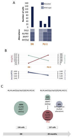 Clinical and molecular characteristics of patient P1. (A) Bar plot depicts the number of cells with a given genotype for each clone that was detected at the moment of diagnosis (DX), 1st follow-up (FU-1) and 2nd follow-up (FU-2). Heatmap below the bars indicates the genotype for each clone: dark blue and light blue are used to indicate the mutated or wild-type state, respectively. (B) Hematological characteristics such as hemoglobin (Hb), platelet count (Plt), leukocyte count (Leu) and absolute neutrophil count (ANC) are indicated for each analyzed time point. (C) Proposed clonal architecture, karyotype and number of analyzed cells for each time point is indicated. Color red distinguishes new acquired alterations in each clone.