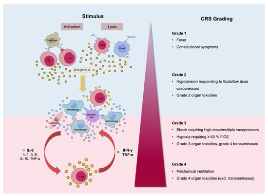Pathophysiology of cytokine release syndrome (CRS) with the activation of different cytokines. The clinical picture can differ from mild, only representing with fever (Grade 1), to life-threatening conditions (Grade 4). Reprinted from Alexander Shimabukuro-Vornhagen et al. J Immunother Cancer 2018;6:56 with permission from the Journal for ImmunoTherapy of Cancer [16].
