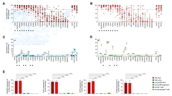 In an attempt to identify the ideal candidates for CAR-T therapy in AML, Perna et al. conducted an extensive analysis of large datasets of transcriptomics and proteomics from malignant and normal tissues [42] (Figure 3). The researchers performed surface-specific proteomic studies in a diverse panel of AML cell lines (THP1, Mono-mac, Kasumi, Molm13, OCI/AML3, and TF-1). The team performed a mass spectrometric analysis, which led to the identification of 4942 proteins. They enriched their protein sets by adding the findings from other similar studies conducted on other AML cell lines (e.g., NB4, HL60, THP1, PLB985, CD32, CD33, CE 96, CD99, and K562). The researchers used data from the Human Protein Atlas, the Human Proteome Map, and the Proteomics Database to identify the protein expression information in different normal tissues/organs such as liver, gallbladder, pancreas, stomach, gut, rectum, testis, epididymis, prostate, breast, etc. [43,44,45]. Consequently, they looked for CAR-T therapy targets that are overexpressed in AML versus normal tissue, and they were able to identify 24 molecules that fulfil this criterion (Figure 3A,B). Using flow cytometry to analyse the expression of the 24 candidates in AML specimens, they managed to detect nine targets that are detected in >75% of the cells (expression range: 78–99%, mean 82%): CD82, TNFRSF1B (also known as CD120b), ADGRE2 (also known as EMR2 or CD312), ITGB5, CCR1 (also known as CD191), CD96, PTPRJ (also known as CD148), CD70, and LILRB2 (also known as CD85d). Six of the nine targets were expressed in <5% in normal tissues (with ADGRE2, CCR1, CD70, and LILRB2 expressed in <5% in freshly purified and activated T cells from healthy donors), whereas the other three were expressed in the normal tissues at a slightly higher level with the maximum expression of 20% (Figure 3C,D). Still, all were much less expressed than their corresponding expression in the primary AML cells. (Figure 3E) [42].