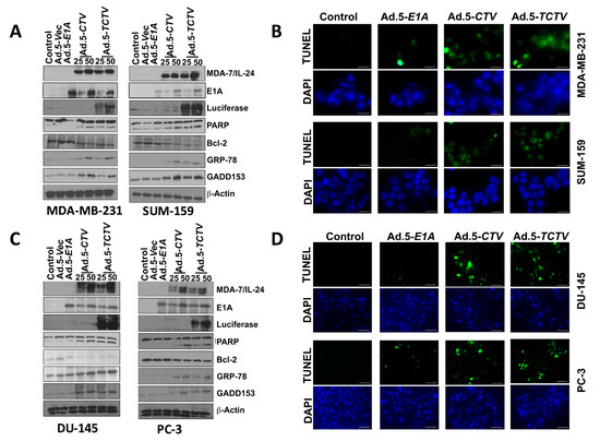 - Su, Z.Z.; Lebedeva, I.V.; Sarkar, D.; Emdad, L.; Gupta, P.; Kitada, S.; Dent, P.; Reed, J.C.; Fisher, P.B. Ionizing radiation enhances therapeutic activity of mda-7/IL-24: Overcoming radiation- and mda-7/IL-24-resistance in prostate cancer cells overexpressing the antiapoptotic proteins bcl-xL or bcl-2. Oncogene 2006, 25, 2339–2348. [Google Scholar] [CrossRef] [PubMed]