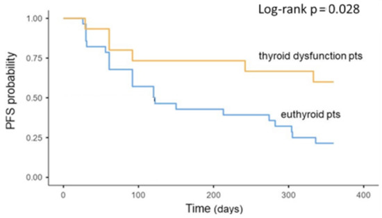 PFS was significantly longer in the group of patients that developed a thyroid dysfunction (p = 0.028); the median PFS of the euthyroid group was 121 days (IQR 92–305.) while the median PFS of the thyroid dysfunction group was not reached (Figure 1).